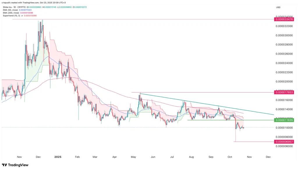 Technically, Shiba Inu price has extended its downtrend after breaking below key support zones. The token remains under pressure as it trades beneath both the 50-day and 200-day Exponential Moving Averages (EMAs).